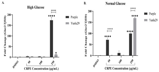 For the HGSC, purple rice phenolic-rich extract significantly increased the expression of Glut2 post CRPE treatment, when compared to the DMSO control (Figure 2A). Higher expression of Glut2 was observed at 250 µg/mL compared to other doses of CRPE. Yunlu29 also significantly increased the expression of Glut2 when compared to the control at 250 µg/mL. On comparing the two extracts, Purple extract displayed a more prominent (p < 0.0001) expression of Glut2 than Yunlu29.