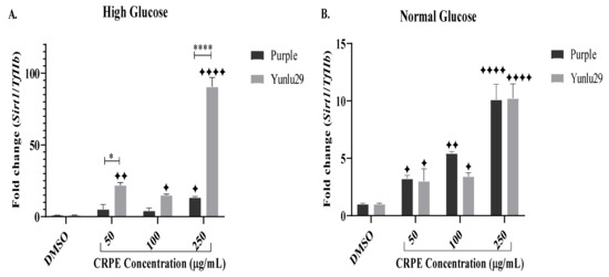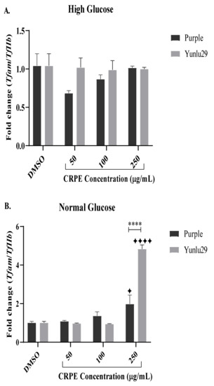 Under NGC, a significant upregulation of Sirt1 was observed post purple CRPE treatments compared to the control (Figure 3B). Yunlu29 displayed a similar upregulation of Sirt1 at 50 and 100 µg/mL phenolic concentrations. To a similar extent, both phenolic-rich extracts displayed significant upregulation of Sirt1 at 250 µg/mL.