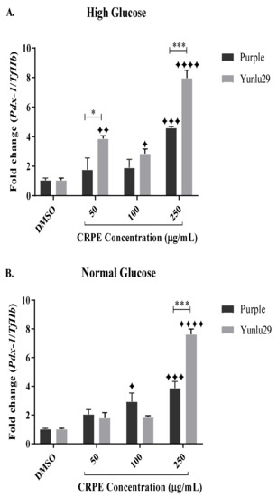 Post treatment, both extracts exhibited significant upregulation of Pdx-1 across all CRPE concentrations, when compared to the control under high glucose conditions (Figure 5A). Purple extract significantly increased the expression of Pdx-1, only at 250 µg/mL, compared to the control. Yunlu29 extract significantly upregulated the expression of Pdx-1 at 50, 100 and 250 µg/mL. When comparing the two extracts, expression of Pdx-1 was higher (p < 0.001) with Yunlu29 extract than the purple variety.