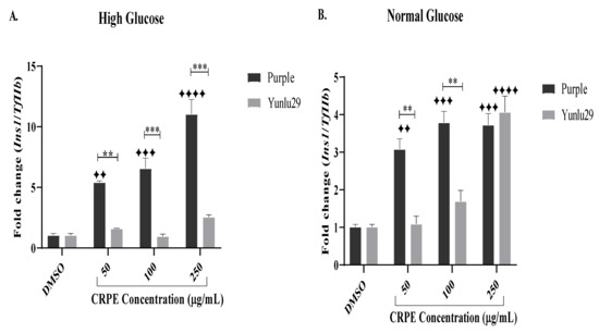 Under NGC, a significant upregulation of Ins1 was observed with all concentrations of purple CRPE treatments when compared to the control (Figure 6B). Yunlu29 generated a significant increase in Ins1 expression at 250 µg/mL. When comparing the two extracts, purple significantly (p < 0.01) upregulated the expression of Ins1 relative to Yunlu29 at 50 and 100 µg/mL.