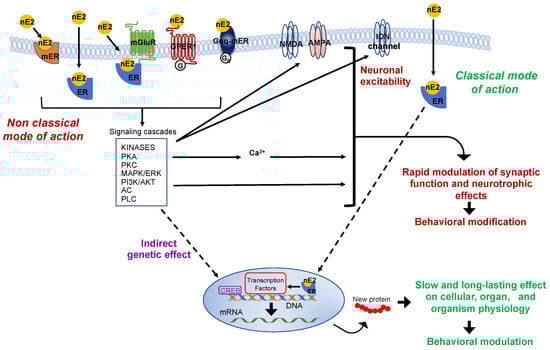 - Cornil, C.A.; Ball, G.F.; Balthazart, J. The dual action of estrogen hypothesis. Trends Neurosci. 2015, 38, 408–416. [Google Scholar] [CrossRef]