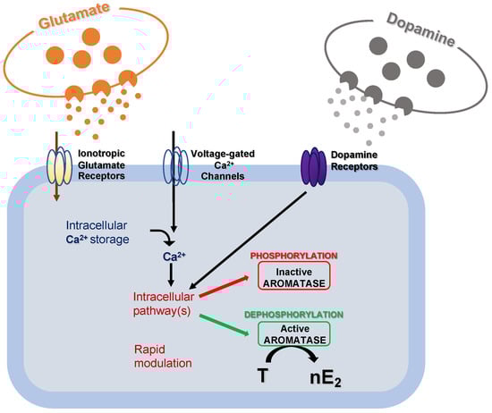 - Balthazart, J.; Baillien, M.; Ball, G.F. Rapid control of brain aromatase activity by glutamatergic inputs. Endocrinology 2006, 147, 359–366. [Google Scholar] [CrossRef] [PubMed]