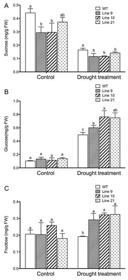2.10. KcTrxf Increases Glucose and Fructose but Decreased Sucrose under Drought