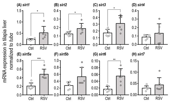 Relative expression levels of SIRT homologues in liver of tilapia fed with the Ctrl and RSV-diet for three days. qPCR analysis was used to compare liver expression levels of sirt1 (A), sirt2 (B), sirt3 (C), sirt4 (D), sirt5a (E), sirt5b (F), sirt6 (G), and sirt7 (H) between juvenile tilapia fed with Ctrl and RSV-diets. The tubulin alpha chain (tubα) was used as a reference gene. White dots and columns indicate the Ctrl group. Gray dots and columns represent the RSV group. Data are presented as mean ± SD (n = 6). Asterisks indicate significant difference (*: p < 0.05, **: p < 0.01, and ***: p < 0.001) between Ctrl and RSV groups.