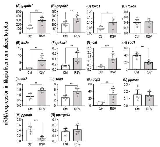 SIRTs are known to upregulate expression of several genes. Since we found that an RSV-supplemented diet increases expression of SIRT isoforms, we next measured expression of known SIRT-target genes, including glyceraldehyde-3-phosphate dehydrogenases (gapdh1 and gapdh2) (Figure 2A,B), forkhead box proteins (foxo1 and foxo3) (Figure 2C,D), insulin receptor substrate (irs2a) (Figure 2E), AMP-activated protein kinase (prkaa1) (Figure 2F), catalase (cat) (Figure 2G), superoxide dismutases (sod1, sod2, and sod3) (Figure 2H–J), uncoupling protein 2 (ucp2) (Figure 2K), and peroxisome proliferator-activated receptors (pparaa, pparab, and ppargc1a) (Figure 2L–N). After feeding with the RSV-diet for three days, gapdh1, gapdh2, prkaa1, pparab, and foxo1 were significantly upregulated in liver of tilapia (Table 1, Student’s t-test; gapdh1: p = 0.0013, gapdh2: p = 0.004, prkaa1: p = 0.0074, pparab: p = 0.0002, and foxo1: p = 0.0124). Thus, our protocol for RSV feeding in tilapia appears to trigger the expected protective responses, including those related to energy metabolism and antioxidative enzymes.