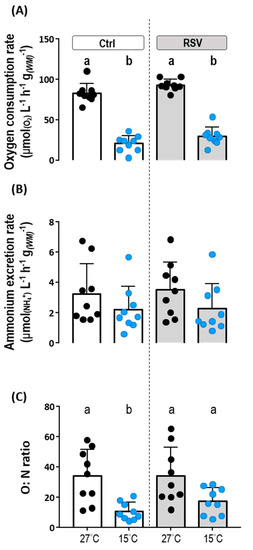 Effects of Ctrl and RSV-diets on oxygen consumption, ammonium extraction rate and O:N ratio at 27 °C and 15 °C. Metabolic rates were measured in fish fed with the Ctrl and RSV-diet by oxygen consumption of intact juvenile tilapia under 27 °C and 15 °C conditions (A). NH4+ excretion rates were determined for fish fed with Ctrl and RSV-diets according to NH4+ concentrations in bath water of intact juvenile tilapia under 27 °C and 15 °C conditions (B). (C) O:N ratios were calculated from oxygen consumption rate and NH4+ excretion rate shown in (A,B). Black dots and white columns represent the Ctrl-diet group at 27 °C. Blue dots and white columns represent the Ctrl-diet group at 15 °C. Black dots and gray columns represent the RSV-diet group at 27 °C. Blue dots and gray columns represent the RSV-diet group at 15 °C. Data are presented as mean ± SD (n = 8 or 9). Different letters indicate significant differences (p < 0.05) among different groups (Two-way ANOVA and Tukey’s HSD).