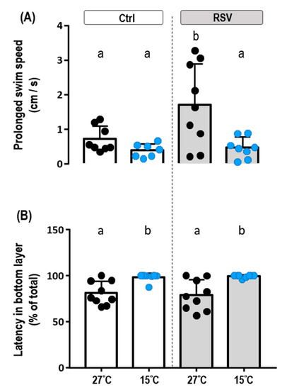 Fish were placed in a novel tank (26 cm long, 8 cm wide, 18 cm deep; water level, 16 cm) (Figure S3A) to assess the locomotion of control- and RSV-fed tilapia at 27 °C and 15 °C. At 27 °C, RSV-fed tilapia showed significantly higher prolonged swim speed (1.70 ± 1.19 cm/s) than the fish fed with control diet (0.71 ± 0.38 cm/s) (Figure 4A, Table 2; p = 0.0277). Both control- and RSV-fed fish kept at 15 °C for three days showed significantly lower prolonged swim speeds compared to those kept at 27 °C: control-diet, 0.38 ± 0.19 cm/s; RSV-diet, 0.46 ± 0.31 cm/s (Figure 4A, Table 2; p = 0.9962). Based on these measurements, the prolonged swim speed of tilapia fed RSV-diet decreased by 72.94% upon exposure to 15 °C, whereas their control diet-fed counterparts had decreases of 46.47%. A representative trace of locomotor activity from a control-diet tilapia is shown in Figure S3B. In addition, there were no significant differences in upper and bottom layer preference between control- and RSV-fed tilapia at either 27 °C or 15 °C. Notably, however, tilapia did show significantly increased spatial preference for the bottom layer at 15 °C compared to 27 °C; this observation was made for both the control and RSV-diet-fed groups (Figure 4B, Table 2; Ctrl: p = 0.0265, RSV: p = 0.0043).