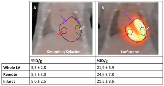 18F-FDG PET/CT fusion images of healthy mice anesthetized with ketamine/xylazine (A) and isoflurane (B); n = 2 per group. Representative standard VOIs are placed in whole LV (purple arrow), remote (red arrow) and infarct region (green arrow).