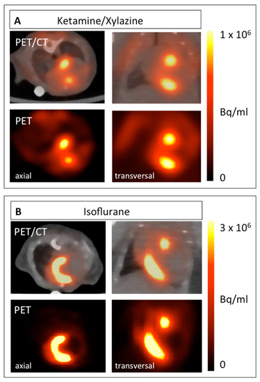 The ketamine/xylazine protocol for anesthetizing healthy mice suppresses glucose metabolism of viable cardiomyocytes in healthy mice significantly compared to isoflurane (Figure 1 and Figure 2). When setting the ranges of the color bars to identical minimum and maximum values, the effect can be clearly visualized.