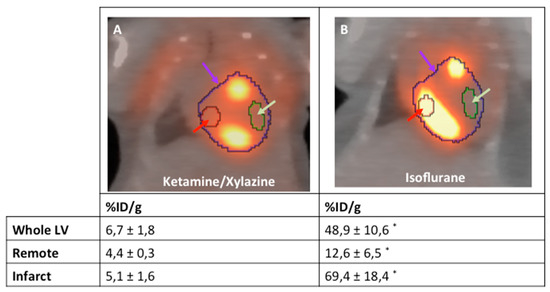 Representative examples of the analysis strategy underlying the protocol for both mice anesthetized with isoflurane (A) and ketamine/xylazine (B) 5 days after MI induction (n = 4 per group). The “entire left ventricle” VOI reflects the global FDG uptake of the LV (purple arrow). The “remote” VOI was positioned in the inferobasal wall and reflects viable myocardium (red arrow). The “infarct” VOI reflects infarct tissue and contains almost no cardiomyocytes (green arrow). *: p < 0.05 compared to animals anesthetized with ketamine/xylazine. Values are presented as mean ± SD. Values are presented as mean ± SD. p-values were calculated using the student t-test.