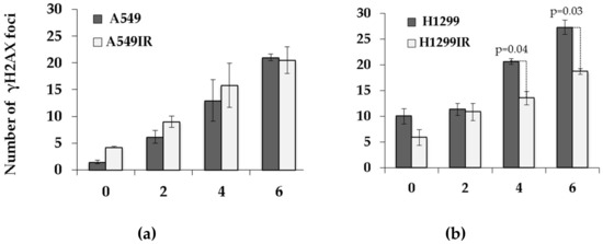 In absence of p53, the kinetics of γH2AX and pATM foci formation in irradiation-surviving H1299IR cells significantly differed from that of parental cells. Indeed, the number of γH2AX (Figure 7c) and pATM (Figure 7d) foci was significantly (p = 0.02) higher in parental H1299 cells compared to H1299IR cells (45 vs. 25 and 35 vs. 15 foci/nucleus, respectively) at 30 min after acute exposure to single dose of 2 Gy. In addition, the parental H1299 cells demonstrated a significant sharp spike in the number of γH2AX and pATM foci (from 45 to 70 and from 34 to 46 foci/nucleus, respectively), with the maximum values observed at 1 h post-IR. Within the same period, the H1299IR cells possessed the modest change of γH2AX foci number. By 8 h post-IR exposure, the number of γH2AX foci declined down to around 20% (H1299 cells) and 50% (H1299IR cells) with parallel respective reduction in number of pATM foci to around 57% (H1299 cells) and 67% (H1299IR cells) of their maximum values at 1 h. Of note, the very subtle kinetic of pATM foci number was observed in irradiation-surviving H1299IR cells with almost complete return to the background values of controls by 8 h post-IR.