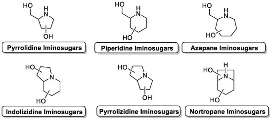 Whether of natural (from plant or microbial world) or synthetic origin, iminosugars contain a wide variety of small organic molecules belonging to the class of pyrrolidines, piperidines, azepanes, nortropanes, pyrrolizidines and indolizidines (Figure 1) [].
