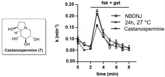 Early studies were carried out by Becq et al. and were focused on the capacity by 4 to restore the trafficking of F508del-CFTR protein by inhibiting the trimming of ER glucosidases []. Iodide efflux experiments, performed in human airway epithelial cells (CF15) [], highlighted a significant F508del-CFTR rescue for 4. The effect was superimposable to that obtained by low-temperature treatment [] (Figure 4). In the same study, a positive response was also observed for the bicyclic iminosugar castanospermine (7), although to a lesser extent than NBDNJ. A similar correction effect was observed for NBDNJ in different delF508-CFTR-expressing human cell lines [,]. The iminosugar 4 was also found to restore 12% mature CFTR and 55% of wild type chloride secretion in intestinal cells of F508del mice []. Both 4 and 7 were found to prevent delF508-CFTR/calnexin interaction in the ER. Due to the inhibition of the cleavage process of terminal glucose residues in the nascent protein in the ER by means of glucosidase inhibition, it was hypothesized that both iminosugars could interfere with the activity of calnexin, preventing UPP (ubiquitin-proteasome pathway)-mediated degradation of the misfolded CFTR protein [].