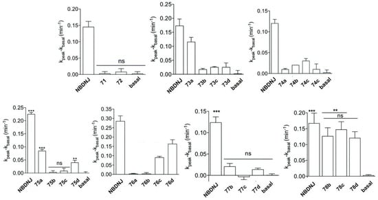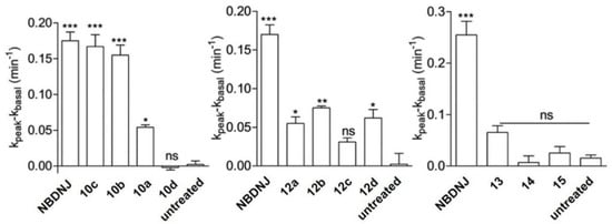 DNJ derivatives 10 and 12a–d were examined for the correction capacity of the CFTR function in CF-KM4 cells [] using iodide efflux experiments (Figure 5) []. Iminosugars 13–15 bearing saturated alkyl chains were also considered [,,,]. No significant rescue capacity of F508del-CFTR activity was observed for most iminosugars, including those bearing longer saturated alkyl chains (13–15) than NBDNJ, as well as those with alkyl chains having fluorine atoms (12a–d). On the other hand, N-homoallyl DNJ (10b) and N-propargyl DNJ (10c) showed a remarkable correction effect, which was comparable to that of NBDNJ (Figure 5).