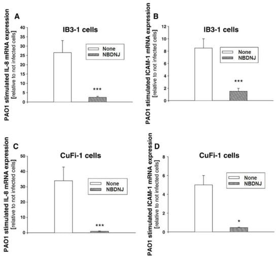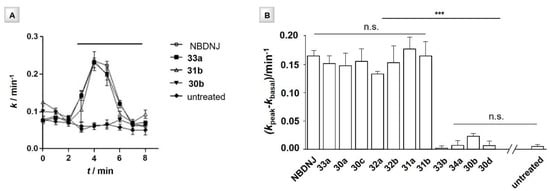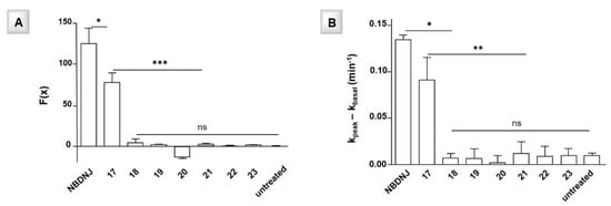 Among the synthesized DNJ derivatives 17–23, only the shortest spacer-containing iminosugar 17 showed an interesting effect regarding the rescue of defective F508del-CFTR function in CF-KM4 cells (however, lower than NBDNJ) [], as highlighted by both single-cell fluorescence imaging (Figure 7A) and iodide effluxes assay (Figure 7B) [,]. Interestingly, differently from NBDNJ, compound 17 did not inhibit ER α-glucosidases, suggesting that the mechanism of action dealing with CFTR correction was not related to its inhibitory properties [].