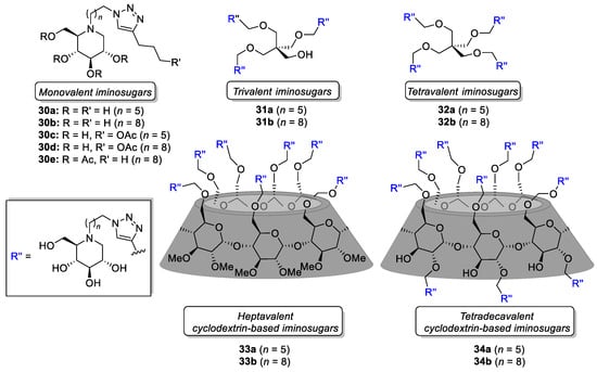 Two classes of compounds having different valencies and alkyl spacer lengths (C6 or C9) were considered: tri-and tetravalent derivatives 31–32, built on a penta-erythritol, and hepta- and tetra-decavalent iminosugar-based cyclodextrins 33–34. In all cases, the molecular systems were conceived to bear N-alkyl DNJ derivatives as peripheral ligands, to obtain “super Miglustat” molecules [].