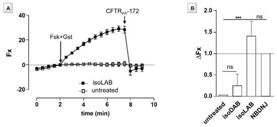 Functional evaluation of F508del-CFTR activity by single-cell fluorescence imaging assay in CF-KM4 cells treated with isoLAB (100 μM, 2 h). (A) Time courses obtained with untreated cells or with cells treated with isoLAB in the presence of forskoline/genistein. (B) Histograms summarizing the results collected from separate experiments. *** p < 0.001; ns, not significant. This figure is reprinted from [], with permission from Elsevier.