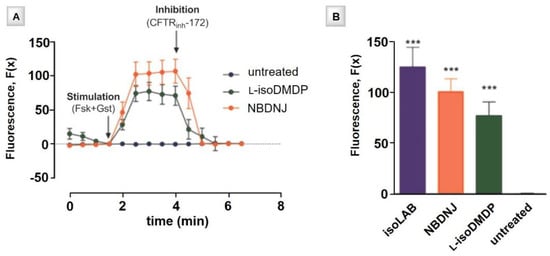 Effect of l-isoDMDP, isoLAB and NBDNJ on the activity of F508del-CFTR in human airway epithelial CF-KM4 cell line, assessed by single-cell fluorescence imaging. (A) Cells were incubated with the iminosugars (100 μM, 4 h) in the presence of forskolin/genistein, followed by inhibition with CFTRinh-172. (B) Histograms summarizing the results collected from separate experiments. *** p < 0.001. This figure is adapted with permission from []. Copyright (2013) American Chemical Society.