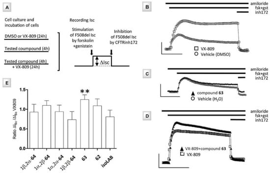 Transepithelial short-circuit currents (Isc) recorded in F508del-CFTR-expressing CFBE cells. (A) Protocols used and model trace indicating ΔIsc. (B–D) Tracings of Isc recorded with CFBE cells incubated with: (B) DMSO or VX-809 (10 μM) (24 h); (C) water or 63 (100 μM) (4 h); (D) VX-809 (10 μM, 24 h) or VX-809+63 (100 μM, 4 h). F508del-CFTR was activated by application of CTR activators and inhibited by CFTRinh172. (E) Summary of the ratio ΔIsc/ΔIsc VX-809 for each compound; ** p < 0.01. A ratio above 1 means a potentiation. This figure is adapted with permission from [].