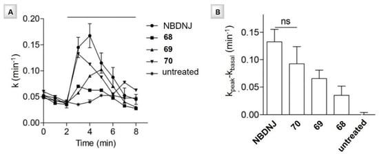 (A) Rescue of functional F508del-CFTR activity: iodide efflux curves on untreated or iminosugar-treated CF-KM4 cells in the presence of forskolin/genistein. (B) Summary of the functional evaluation of F508del-CFTR: histograms represent the mean (± SEM) of four experiments obtained by the iodide efflux technique in cystic fibrosis (CF) cells untreated or treated (100 μM, 2 h) in the presence of forskolin/genistein. *** p < 0.001; n.s., not significant. This figure is adapted with permission from []).