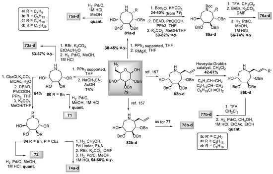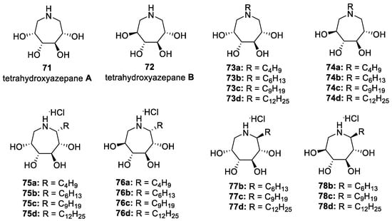 - Désiré, J.; Mondon, M.; Fontelle, N.; Nakagawa, S.; Hirokami, Y.; Adachi, I.; Iwaki, R.; Fleet, G.W.J.; Alonzi, D.S.; Twigg, G.; et al. N- and C-alkylation of seven-membered iminosugars generates potent glucocerebrosidase inhibitors and F508del-CFTR correctors. Org. Biomol. Chem. 2014, 12, 8977–8996. [Google Scholar] [CrossRef] [PubMed]