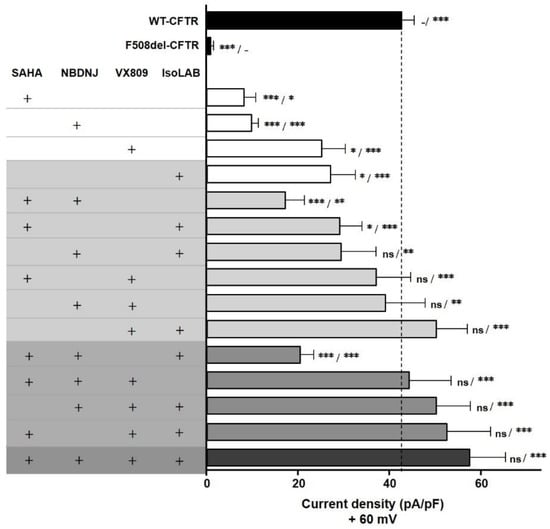 The rescue of defective protein was evaluated by recording short-circuit currents (Isc) in F508del-CFTR-expressing human airway epithelial cells CFBE (Figure 13).