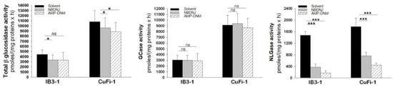 The potential of l-isoDMDP on the rescue of defective F508del-CFTR function was evaluated in CF-KM4 cells and compared with the corrector effect of NBDNJ and isoLAB (Figure 12). l-isoDMDP showed a significant correction effect, albeit lower than either NBDNJ or isoLAB. As for isoLAB, the molecule did not show significant inhibition of ER-resident α-glucosidases I and II.