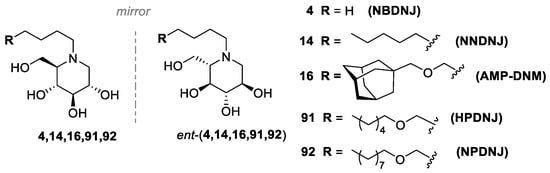 Thanks to their simple and small structure strictly related to carbohydrates, iminosugars are endowed with an excellent drug profile. Indeed, they are water soluble and therefore orally administrable, they show an efficient uptake [], taking in some cases advantage from transport mechanisms devoted to handling of carbohydrates. The ability of iminosugars to cross the blood–brain barrier can be ascribed to the same cellular mechanisms []. However, because most iminosugars typically lack the acetal function of carbohydrates, they are chemically and biologically stable during the main processes carried out by carbohydrate-modifying enzymes, allowing their unchanged excretion essentially in urine.