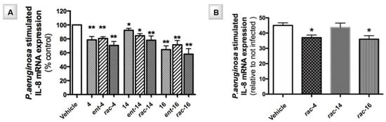 (A) Functional evaluation of F508del-CFTR by DiSBAC2(3) assay in CF-KM4 cells treated or not with iminosugar (100 μM, 2 h). (B) F508del-CFTR was assayed with the iodide efflux technique in the presence of forskolin/genistein. * p < 0.05; ** p < 0.01; *** p < 0.001; ns, not significant. This figure is republished with permission of the Royal Society of Chemistry, from []; permission conveyed through Copyright Clearance Center, Inc.