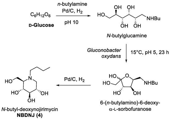 Because of its involvement in a variety of therapeutic contexts, a plethora of synthetic routes to NBDNJ and most generally to N-alkyl DNJ derivatives have been reported [,,,]. Large-scale access to NBDNJ is achieved starting from glucose and butylamine through a one-pot chemo-enzymatic route, involving the selective oxidation of C2 by Gluconobacter oxydans [] and the subsequent ring expansion under reductive conditions (Scheme 1) [,]. The synthesis was developed by Searle/Monsanto in view of the evaluation of NBDNJ in anti-HIV clinical trials [].