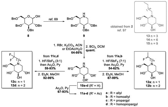 The results obtained with NBDNJ inspired a variety of structural modifications, which were proposed with the aim to obtain more selective and potent derivatives [,,]. Cendret et al. evaluated a variety of N-substituted iminosugars as F508del-CFTR correctors []. The synthesis of all compounds involved the use of tetra-O-benzyl-deoxynojirimycin (9) (Scheme 2). The latter was in turn obtained from commercially available tetra-O-benzyl d-glucopyranose (8), using the scalable procedure reported by Wennekes et al. []. Direct N-alkylation of 9 provided unsaturated derivatives 10 []. Functionalization of double and triple bonds of 10a–d was then accomplished through hydrofluorination of the corresponding tetra-acetate derivatives 11a–d, exploiting HF/SbF5 as the fluorinating agents in various combination ratios (Scheme 2) [,,].