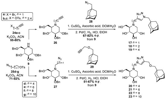 Tetra-O-benzyl-DNJ (9) was derivatized with alkyl chains bearing an alkynyl or an azido terminal moiety, leading to N-alkyl iminosugars 26,27 (Scheme 3).