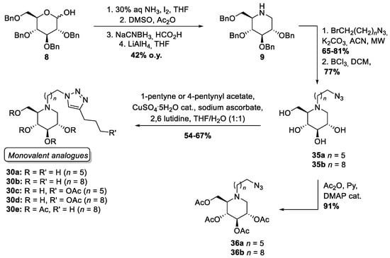 The synthesis involved the formation of amine 9 starting from glucose 8 and the subsequent base-mediated alkylation of 9, to provide azide-bearing N-hexyl and N-nonyl DNJ derivatives 35a–b (Scheme 4) []. Click reaction of the last ones with 1-pentyne or 4-pentynyl acetate in presence of CuSO4·5H2O and sodium ascorbate [,] led to monomeric iminosugars 30, which were used as controls to assess the multivalent effect.