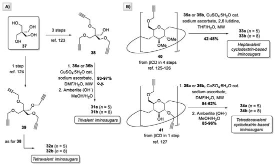 Iminosugar-based multivalent systems 31–34 were synthesized from both 35 and its peracetylated derivatives 36 (Scheme 5) [,]. CuI-catalyzed click coupling of 36 with propargyl ethers 38 and 39, in turn obtained from tetraol 37 [,], gave the tri and tetra-valent iminosugars 31 and 32 (Scheme 5A). Cyclodextrin-based DNJ clusters 33 and 34 were instead prepared through click reaction of 35 and the cyclo-oligosaccharide 40 [,] or between 36 and alkyne 41 (Scheme 5B) [].