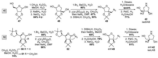 Research on isoDAB and isoLAB took place in the frame of a SAR study involving the evaluation of inhibitory properties of natural 1,4-dideoxy-1,4-imino-d-arabinitol (DAB, 43) and its enantiomer 1,4-dideoxy-1,4-imino-l-arabinitol (LAB, ent-43) against several glycosidases [,,,]. From a synthetic standpoint, starting from acetonide d-ribose 47, a Ho crossed aldol reaction allowed the introduction of the branching hydroxymethyl group on the pyrrolidine scaffold. Subsequent reduction and oxidative cleavage led to lactol 48, which was in turn converted into the azido-lactol 49. The subsequent reduction of the azido group eventually enabled intramolecular rearrangement, to give the pyrrolidine isoDAB (42; Scheme 6A). Similarly, its enantiomer isoLAB (ent-42) was prepared by a synthetic pathway from diacetonide d-mannose (50; Scheme 6B) [,].