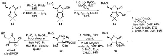 Similarly to isoDAB/isoLAB, research on l-isoDMDP was inspired by the powerful and selective inhibitory ability of l-DMDP against α-glucosidases []. The synthesis of l-isoDMDP was based on a sequence of 11 reaction steps starting from d-lyxonolactone acetonide (53), in turn obtained from d-galactose. Even in this case, the introduction of the branching hydroxymethyl group was performed by means of the Ho reaction, enabling the conversion of hemiacetal 54 into lactone 55. After azido group introduction in 56, pyrrolidine ring closure was accomplished through a procedure involving elaboration of the sugar core and reductive amination, to provide the target l-isoDMDP (Scheme 7) [].