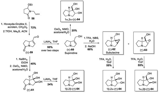 The synthesis of all compounds involved an intramolecular acid-mediated Morita–Baylis–Hillman reaction as the key step (TfOH/Me2S) [], enabling the formation of the bicyclic compound ±59 from a pyrrolidine scaffold and thereby the access to racemic supinidine (±60) after reduction of the aldehyde function (Scheme 8). Then, double bond epoxidation accomplished via bromohydrin formation led to subulacine ±62 and its diastereoisomer ±63, while the four diastereoisomers ±64 were obtained by epoxide-ring opening of ±62 and ±63 under acidic conditions (TFA/H2O) or double bond OsO4-catalysed cis-dihydroxylation of ±59 or ±60 [].