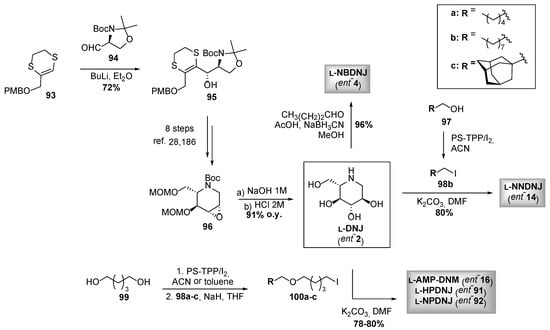 - Dehoux-Baudoin, C.; Génisson, Y. C-Branched Imino Sugars: Synthesis and Biological Relevance. Eur. J. Org. Chem. 2019, 2019, 4765–4777. [Google Scholar] [CrossRef]