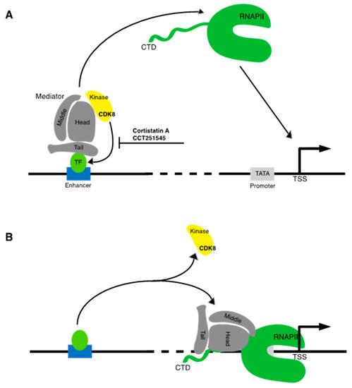- Tsai, K.L.; Sato, S.; Tomomori-Sato, C.; Conaway, R.C.; Conaway, J.W.; Asturias, F.J. A conserved Mediator-CDK8 kinase module association regulates Mediator-RNA polymerase II interaction. Nat. Struct. Mol. Biol. 2013, 20, 611–619. [Google Scholar] [CrossRef]