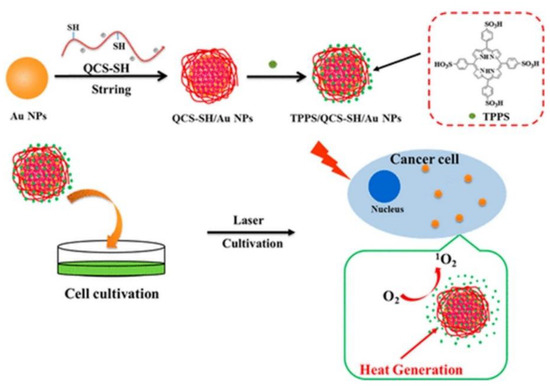 Proposed fabrication of meso-tetrakis (4-sulphonatophenyl) porphyrin (TPPS)/QCS-SH/gold nanoparticles (AuNPs) for dual mode photodynamic therapy (PDT)/photothermal therapy (PTT) treatment of cancer. Reprinted with permission from ref. [58]. Copyright 2018 American Chemical Society.
