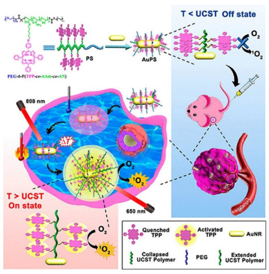 - Huang, B.; Tian, J.; Jiang, D.; Gao, Y.; Zhang, W. NIR-activated “OFF/ON” Photodynamic therapy by a hybrid nanoplatform with upper critical solution temperature block copolymers and gold nanorods. Biomacromolecules 2019, 20, 3873–3883. [Google Scholar] [CrossRef]