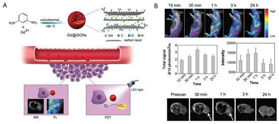 (A) Preparation of Gd@GCNs nanoplatform for imaging-guided phototherapy in solid tumors, (B) In vivo fluorescence images acquired from tumor-bearing nude mice after intravenous injection of Gd@GCNs at different time intervals, noting significant tumor shrinkage over time after PDT treatment. Reprinted with permission from ref. [116]. Copyright 2018 Wiley Online Library.