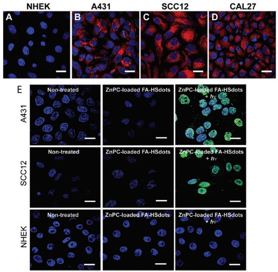 Ultra-small hollow silica nanocarriers (HSdots) (~10 nm) were fabricated within studies performed by Dam et al. (2019) [131]. These HSdots were then coated with a porphyrin zinc phthalocyanine (ZnPC) PS for the in vitro PDT treatment of human cutaneous and head/neck squamous cell carcinomas (SCC) cell lines-A431, SCC12 and CAL27, with normal human epidermal keratinocytes (NHEK) as a normal control cells line [131]. Studies have reported that silica nanomaterials are highly biodegradable and so extremely suitable for drug delivery in cancer cells [132]. A higher cellular uptake of ZnPC-loaded HSdots was reported in SCC cell lines, due its cancer targeted modification with folic acid, in comparison to NHEK cells (Figure 4A–D) [131]. Furthermore, the in vitro PDT treatment of SCC cells at 671 nm laser exposure resulted in more than 90% cell death, whereas no evidence of dead cells was found in NHEK cells (Figure 4E), suggesting this form of treatment for skin cancer is highly probable [131].
