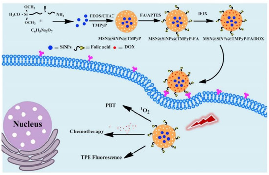 Schematic illustration of the preparation of MSN@SiNPs@TMPyP-FA for enhanced PS and doxorubicin (DOX) drug delivery for improved PDT and chemotherapeutic outcome treatments in cancer cells, with TPE fluorescence. Reprinted with permission from ref. [136]. Copyright 2020 Elsevier.