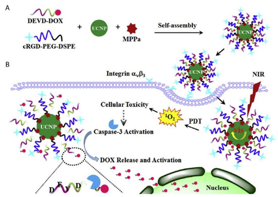 Schematic illustration of (A) fabrication of functionalized upconversion nanoparticles (MPPa/UCNP-DEVD-DOX/cRGD), (B) proposed mechanism of PDT action, activation of the caspase-3 and release of chemotherapeutic DOX. Reprinted with permission from [145]. Copyright 2017 Elsevier.