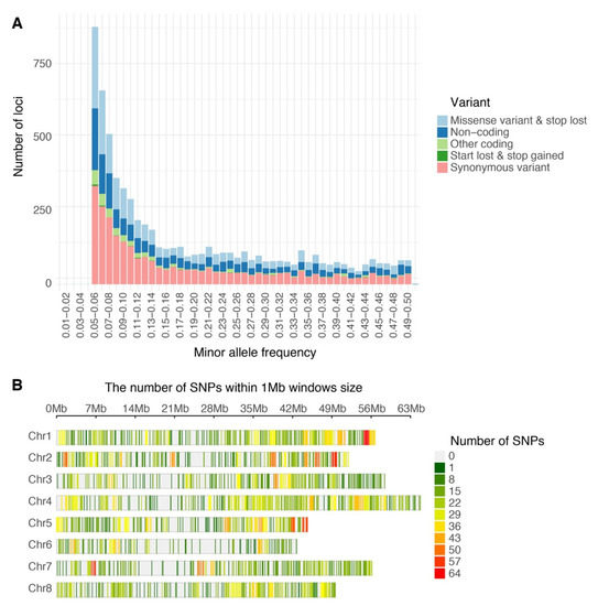 Single nucleotide polymorphism variants (SNVs) identified in alfalfa (Medicago sativa) populations developed in Logan, Utah (A) Histogram of filtered variants called by Next Generation Sequencing Experience Platform (NGSEP) showing distribution by minor allele frequency and classified by function after annotation. (B) Distribution of GBS SNP markers across eight Medicago truncatula chromosomes using 1 Mb window. The colored lines represent the marker density as showing on the right color legends.