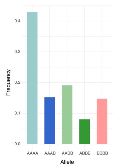 Frequency of allele dosage in autotetraploid alfalfa (Medicago sativa) for 6862 high-quality biallelic SNVs obtained from NGSEP pipeline in the Logan dataset. A represents dosage of the major allele and B is for the minor allele dosage.