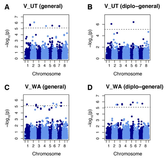 Manhattan plots showing marker–trait association for vigor (V) in alfalfa populations at Othello Washington (WA) and Castle Dale Utah (UT). (A) Markers identified by general model in the UT dataset. (B) Markers identified by diplo-general model in the UT dataset. (C) Markers identified by general model in the WA dataset. (D) Markers identified by diplo-general model in the WA dataset. The threshold of 0.05 was used for significant markers according to the Bonferroni method.