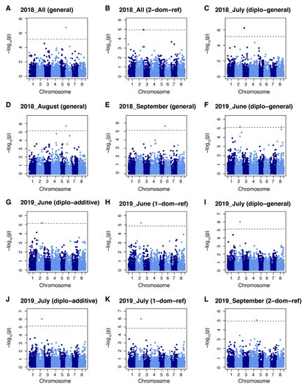 Manhattan plots showing marker–trait associations for yield datasets in alfalfa (Medicago sativa) at Othello, Washington over two years. (A) Markers identified by general model in All 2018. (B) Markers identified by 2-dominant reference model in All 2018. (C) Markers identified by diplo-general model in July 2018 dataset. (D) Markers identified by general model in August 2018. (E) Markers identified by general model in September 2018. (F) Markers identified by diplo-general model in June 2019. (G) Markers identified by diplo-additive model in June 2019. (H) Markers identified by 1-dominant reference model in June 2019. (I) Markers identified by diplo-general model in July 2019. (J) Markers identified by diplo-additive model in July 2019. (K) Markers identified by 1-dominant reference model in July 2019. (L) Markers identified by 2-dominant reference model in September 2019 dataset. Markers threshold was set using Bonferroni > 0.05.