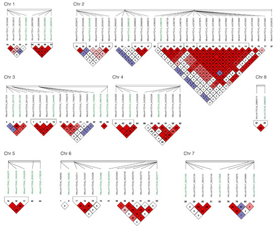 Linkage disequilibrium (LD) among markers associated for yield and vigor under salt stress. Haploview v4.2 [14] and pairwise LD values () were used for 27 SNPs associated with yield and vigor under salt stress (green color) and their surrounding SNPs in 10 kb (black color). Bright red coloring indicates ; blue coloring indicates ; white coloring indicates ; shades of pink/red coloring indicates .